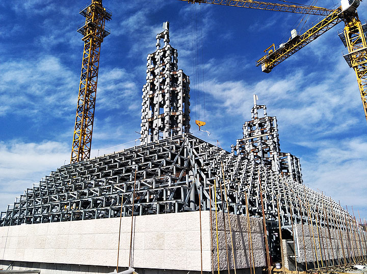 黃帝問道大項目是“帝師之鄉(xiāng)”汝州的重點大型城雕項目,也是當?shù)氐貥诵越ㄖ?。該項目肩負著弘揚汝州歷史文化和華夏文明的重任,承載了太多榮耀和希冀。雕像基底面積1400平方米,人像總高度59.8米,主體結(jié)構(gòu)采用圓管鋼框架,外側(cè)采用干掛石材雕塑,總用鋼量2300噸,設計使用年限為100年。雕塑內(nèi)部水、電、消防配套齊全。要用鋼結(jié)構(gòu)、石塑傳神地塑造中華民族敬為人皇的黃帝雕像,不失神韻和靈氣,其難度可想而知。三新不負重托,攻克所有的技術(shù)難題,把大師畫卷中的意象用建筑語言完美呈現(xiàn),體現(xiàn)了三新建筑技術(shù)與藝術(shù)完美融合的建筑理念。施工過程中汝州市政府各級領(lǐng)導多次到現(xiàn)場檢查指導,對工程質(zhì)量贊賞有加。我們一起見證了精品的煉成,其中凝聚了三新人的心血和智慧,更體現(xiàn)了三新的創(chuàng)新精神。如今被評為“中國鋼結(jié)構(gòu)金獎”工程,更是實至名歸。三新帶您一睹黃帝風采,領(lǐng)略華夏文明。