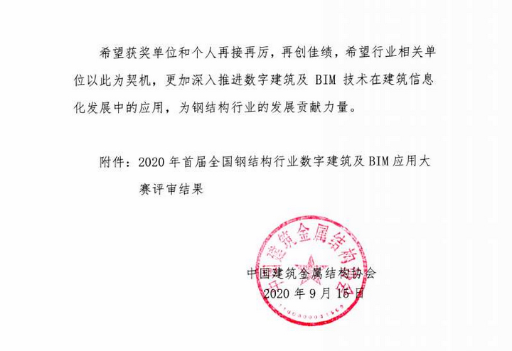 本次大賽由中國建筑金屬結(jié)構(gòu)協(xié)會鋼結(jié)構(gòu)分會承辦,旨在推進數(shù)字建筑及BIM技術(shù)在建筑信息化發(fā)展中的應用,深化BIM技術(shù)在鋼結(jié)構(gòu)工程中的實踐,創(chuàng)新BIM專業(yè)技術(shù)人才培養(yǎng)機制。大賽對于提高我國建筑業(yè)建筑信息模型技術(shù)的應用水平,實現(xiàn)真正意義上轉(zhuǎn)型升級,提升工程質(zhì)量和效率、降低造價和節(jié)約資源,推動技術(shù)創(chuàng)新、質(zhì)量創(chuàng)優(yōu)和人才隊伍建設有著積極的推進作用。同時相信隨著BIM應用的進一步展開,我公司的裝配式建筑發(fā)展將如虎添翼,我司 BIM團隊會取得更加優(yōu)異的成績!