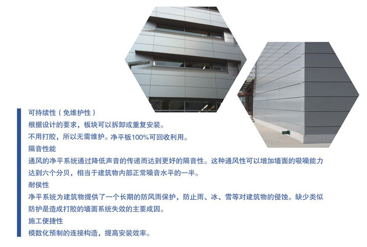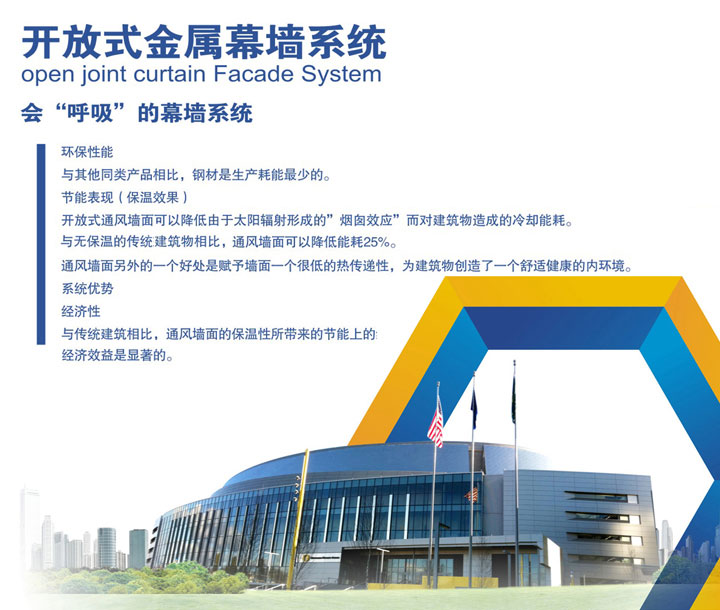 • 凈平開放式金屬幕墻系統(tǒng)----模數(shù)化的預(yù)制構(gòu)造,使安裝更便捷,效率更高。